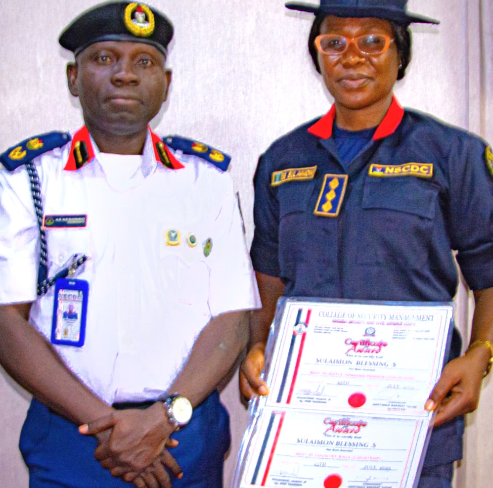 Kwamandan Hukumar Tsaro da Kare Fararen Hula ta Ƙasa (NSCDC) na Jihar Legas, Mista Keshinro Adedotun, ya karrama jami’ai goma (10) da suka nuna bajinta a cikin horo da sake horarwa da aka gudanar a Kwalejin Kula da Tsaro da ke Oke-Mosan, Abeokuta, Jihar Ogun.